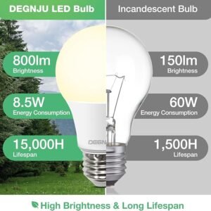 - 【Energy Efficient & Cost-saving】Adopting energy-efficient LED chips, DEGNJU A19 LED light bulbs save up to 90% on your electricity bill by replacing 60 watts incandescent light bulbs. They provide more energy efficiency but less heat output, making them a great alternative to 60W incandescent bulbs. Also, these 2700K soft white LED light bulbs largely reducing your energy bills of frequent re-lamping while providing the same lighting quality.