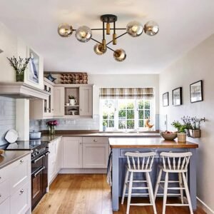 6-Light Glass Globe Sputnik Chandelier Modern Matte Black and Gold Ceiling Light Fixture Vintage Hanging Chandeliers for Farmhouse Living Room, Kitchen Dining Room Bedroom